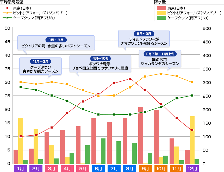 ビクトリアの滝を旅の目的とする場合、1~8月がベストシーズンです。「紫の桜」として有名なジャカランダのお花を目的とする場合、9月末~11月中旬が開花時期に当たりますのでベストシーズンと言えます。尚、南アフリカは固有種のお花が多いことでも知られていますが、ツアーご案内するカーステンボッシュ植物園では、年間を通して様々な南アフリカ固有種をご覧いただくことができます。