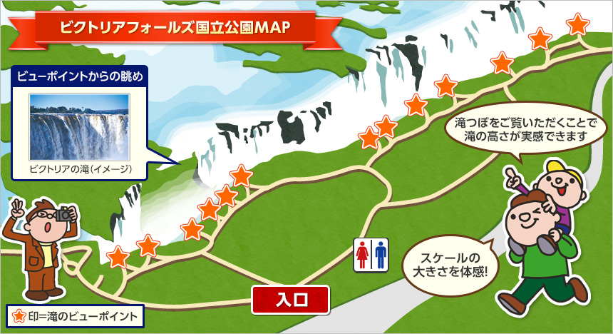 ツアーでは、ビクトリアフォールズ国立公園内を1時間30分~2時間程度歩いて観光します。公園内は遊歩道が整っており、途中途中に滝のビューポイントがあります。ビューポイントで写真タイムを取りながら、様々な角度からのビクトリアの滝をお楽しみいただきます。遊歩道については、基本的には平らで歩きやすいものですが、一部傾斜や滑りやすい箇所もありますので、ご注意ください!