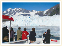 船に乗って、プリンスウィリアムス湾を航行。ラッコやアザラシ、イルカやクジラが生息する場所を航行します。また今も尚、進行している大きな氷河の前で、氷河の崩落を待ちます。轟音と共に、崩れ落ちる姿は圧巻!
