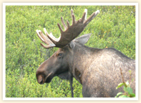 ムース(ヘラジカ)は、哺乳網偶蹄目シカ科ヘラジカ属に分類されるシカ。体長240~310cm。体重200~825kg。シカ科最大種であり、北方に生息する偶蹄類でも最大級の動物である。雄の成獣は箆のように平たい角を持つことが和名の由来。角は大きく最大で200cmを上回る。針葉樹林と針葉樹と落葉樹の混合樹林に生息し、夏は単独もしくは数頭の群れで生活するが、冬になると10頭前後の群れを形成する。食性は草食性で、木の葉や樹皮、地面に落ちた種実類、水草等を食べる。水場を好み、夏にはよく水場に来て、水中の水草を食べたり、泳いで体に付いた寄生虫を落としたりする。
