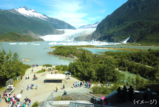 アラスカの州都であり、背後に雪や氷河を抱いた山々が迫る土地。山で囲まれている為、ジュノーに行くには、飛行機か船しか交通手段が無い為「アメリカで最も安全な州都」とも呼ばれています。ジュノーの代表的な観光地が、メンデンホール氷河。氷壁の高さは約30.4メートル、全長19.3キロの巨大氷河です。