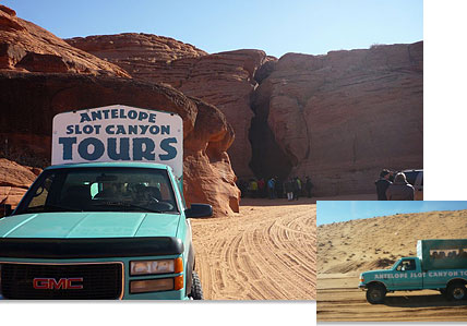 左の写真にあるようなナバホ族の専用車に乗り込んで、舗装路と砂道に揺られること約20分。神秘の迷宮アンテロープキャニオンの入り口に到着します。キャニオンの中は右側通行で、足元はほぼ平坦です。同じ道を行って帰って、往復約45分かけて観光します。写真を撮らずに歩くと、約5分で通り抜けてしまうくらいの長さですので、それほど長く歩く心配もございません。