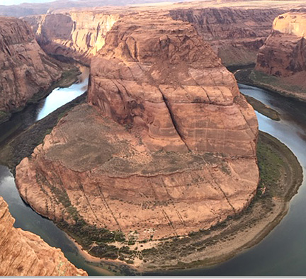 ちなみに下を流れるコロラド川の「コロラド」とは、スペイン語で「赤茶けた」という意味があります。コロラド川上流にダムが出来る前は、コロラド川は毎日大量の土砂を運んでいたため川の色が赤茶色でしたが、現在はダムで水量をコントロールしているため、藻が繁殖し緑色をしたコロラド川となっています。