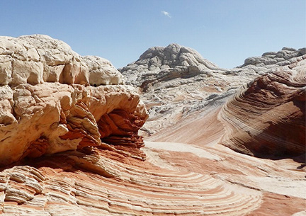 アメリカ・アリゾナ北部一帯に広がるバーミリオン・クリフ国立モニュメント内にある「ホワイトポケット」。脳みそのような形状の奇岩ブレインロックや縞模様が印象的な地層など、まるで違う惑星に降り立ったような感覚を覚えます。