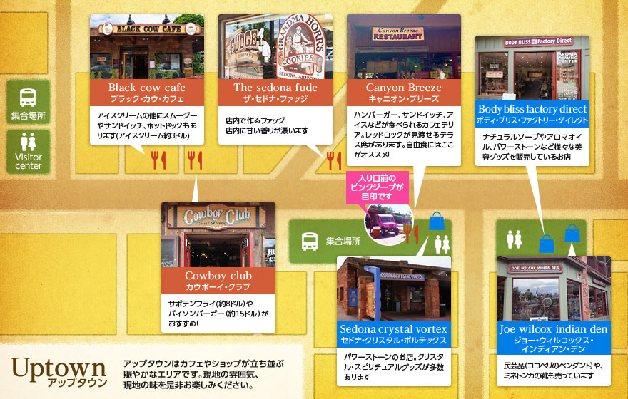 アウトドア、癒し、グルメ、芸術の街として有名で、皆さんの立ち寄られるアップタウンは絶景と街歩きを楽しみながら、メイド・イン・セドナのお土産や自分ならではの一点ものと出会うのに最適な場所です。