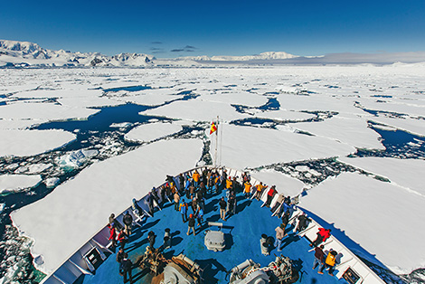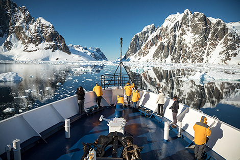 南極半島とブース島との間に位置するルメール海峡は、両端に切り立った断崖がそそり立ち、風光明媚な海峡として特に有名です。ルメール海峡をクルージングすると、デッキからは両端に大迫力の山々が迫ります。1870年代に発見されたこの海峡は、約20年後にゲルラーシェが初めて航海しました。絶壁に閉ざされた海峡は別名「コダック・ギャップ」と呼ばれています。