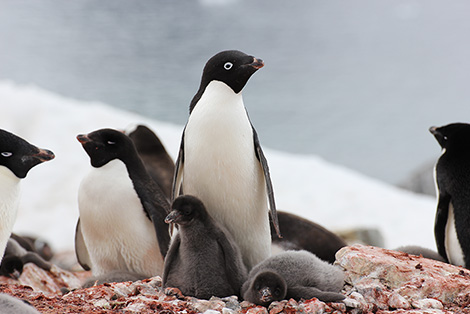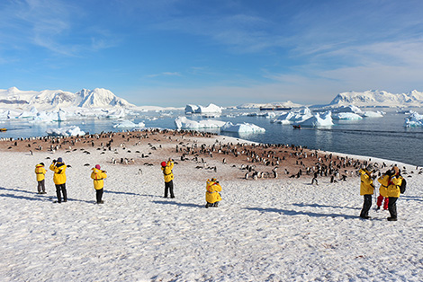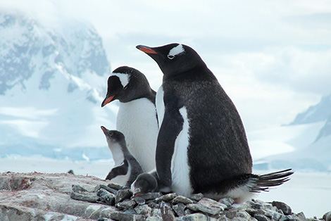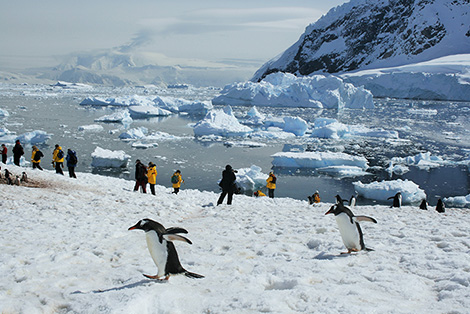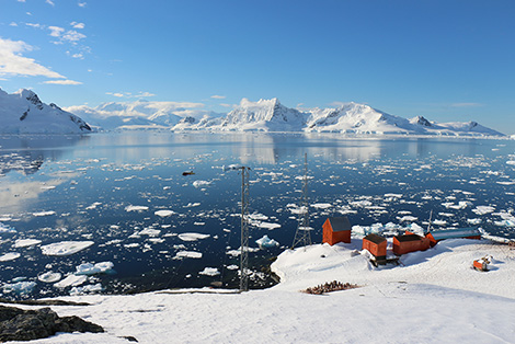 ネコハーバーという地名は、20世紀初頭に活躍したノルウェーの捕鯨船ネコ号に由来したものです。小高い丘になっており、雪の丘に登ると周りの山々や氷河の絶景が広がっています。ジェンツーペンギンの営巣地としても有名で、よちよちと歩く可愛らしい様子を間近で観察できます。子育て中の時期には、ペンギンの子どももご覧いただけるでしょう!