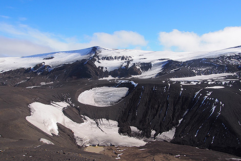 馬蹄系をしたカルデラ島で、南極では珍しく地表がむき出しになっています。火山の影響で地熱が熱く、海水から湯気が立っていることもあります。19世紀初頭には、南極の嵐や氷山からの避難場所としても利用され、ノルウェーとチリの基地があります。