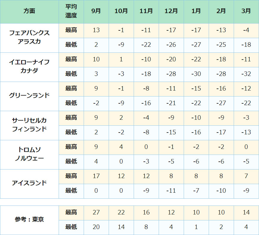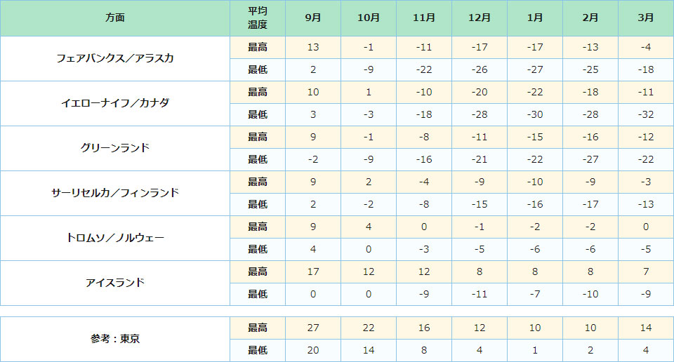 各方面の気温9月~3月までの平均最高気温と平均最低気温