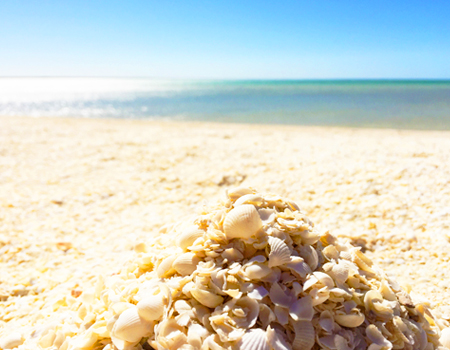 花びらのような小さな貝殻が深さ7~10メートル、長さ110キロにおよぶビーチ一面を覆いつくし、眩しいくらいの白が青い空と一体となって、大自然の美しい光景を作り出しています。