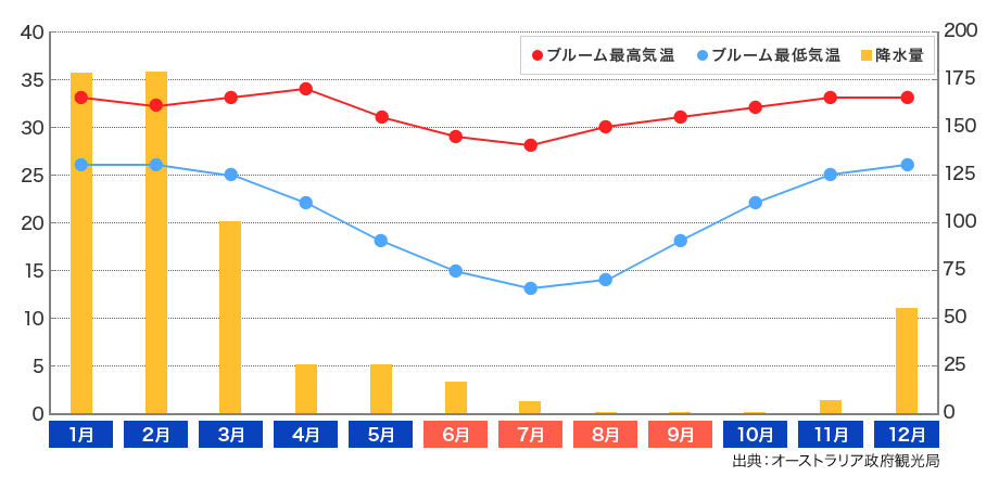 真珠の街、美しい白砂のビーチとして知られるトロピカルなリゾートタウン。実は、明治時代から真珠を通して、日本と深く長い歴史を持っています。街の西約4kmに位置するケーブルビーチへは、見渡す限り紺碧の海の色と真っ白な砂浜が22kmも続きます。このビーチで最も人気のアトラクションのひとつ、キャメルライドはインド洋に沈む夕陽をラクダに揺られてゆっくり眺める、まさに異国の体験です。また、3月~11月の満月の夜、干潮のローバック湾に映る月のあかりがまるで月へのぼる階段のように見えることから、「月への階段」(Staircase to the Moon)と呼ばれ人々を惹きつけています。