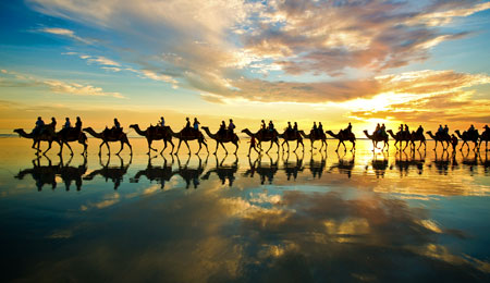 1回目はらくだの背に乗り、海の向こうに沈む夕日を眺め、2回目は夕日を背に連なるらくだを写真に収めましょう。22kmもの真っ白な砂浜が続くケーブルビーチ、インド洋に沈む夕日は息を呑む光景です。