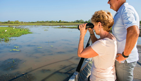 カカドゥのハイライト観光は動物が活発に動く早朝がおすすめ。野鳥やワニなど湿原で生きる野生動物を間近に観察できます。