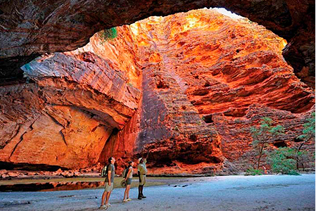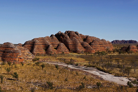 世界遺産・パヌルル国立公園内にある、先住民が4万年ものあいだ守り続けてきた聖地・バングルバングル。約3億5000年前に、山から流れる川の砂が年月とともに隆起し、その後2000万年にもわたる風雨の侵食によって今の姿になったと言われています。独特の丸みを帯びた砂岩は、オレンジと黒の横縞の入った蜂の巣のような形をしており、その高さは約250mに及ぶものまであります。国立公園が開園するのは4~12月のみで、雨季は立ち入り禁止となっていますが、今ではこのエリアで最も人気の高い観光地となりました。