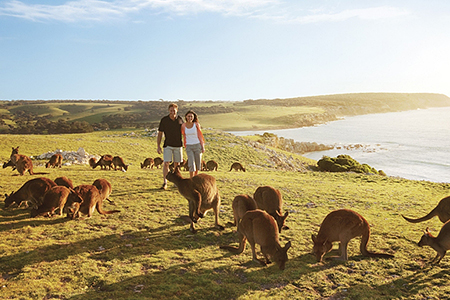 南オーストラリア州にある、オーストラリアで3番目に大きい島(東京都の約2倍の広さ)・カンガルー島。島内の多くのエリアが国立公園や自然保護公園に指定されています。島名の由来ともなったカンガルーをはじめ、コアラやアシカなどの野生動物が多数生息しています。また、春から夏(8~11月)にかけては、固有植物であるワイルドフラワーが咲き乱れ、島の景観に色を添えてくれます。