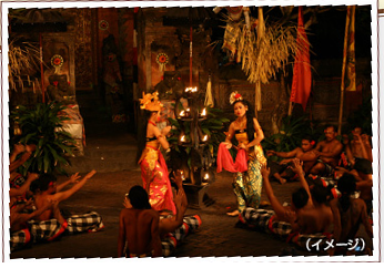 別名「モンキーダンス」「男性合唱劇」。サルの鳴き声を真似た掛け声が「ケチャ」と聞こえることからケチャックダンスと呼ばれています。楽器は使用せず、数十人の男性がいくつかのパートに分かれ一斉に歌い出す様は圧巻です。