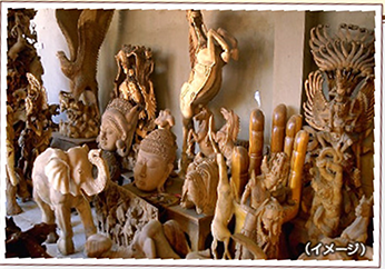 特にマス村は彫刻の村として有名で、弊社でもご案内するツアーが多くございます。工房では12~13歳ぐらいの子供たちが見事なノミさばきを見せてくれます。黒壇やチークなどの硬質の木材を使用しているので、この村の木彫りは繊細であると同時に力強いのが特徴です。ガルーダ像や古来の物語に登場する神様や魚、人間などをモチーフにしたものも多数お買い求めいただけます。
