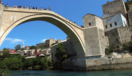 モスタルは銃弾の跡がいまでも多く残る街です。街のシンボル「スタリ・モスト」をご覧ください。紛争によって1993年破壊、ユネスコの協力で2004年に再建されました。