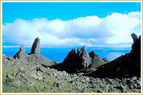 「霧の島」と呼ばれるスカイ島。険しい山々と青い海に包まれ、絵画のような幻想的な風景が広がっています。
