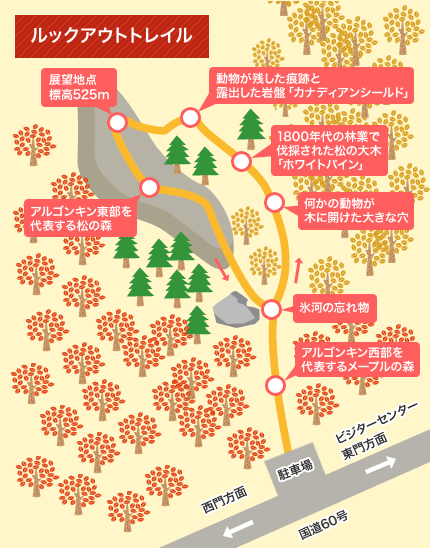 アルゴンキン州立公園観光のメインはこの紅葉ハイキングです。約2kmの周回コースで、駐車場から展望台までの高低差は約70mです。1周約1時間から1時間半ほどのハイキングにご案内致します。