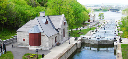 オタワ市内の中心を流れる全長202kmの運河、世界遺産です。オタワ・ロックスと呼ばれる24の水門があり、この水門を利用して水位を調整しながら船を進ませる仕組みになっています。冬は運河が凍り、世界最長のスケートリンクと姿を変え、観光客はもちろん市民の通勤の足としても利用されています。