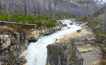 ロッキー山脈の西側に位置するクートネイ国立公園は、東側とは異なり比較的緩やかな山々がと深い森林が広がっています。ツアーでもご案内することの多いマーブル渓谷は、氷河から流れ出る川が長い年月をかけて侵食して作り出した、まさに地球の歴史を感じられるスポットとしても人気です。