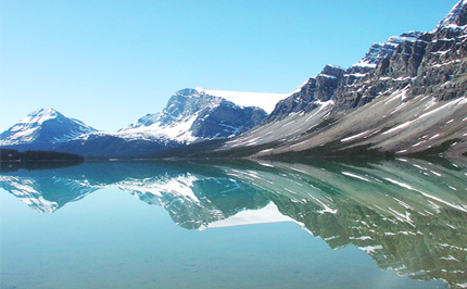 ボウ湖はボウ氷河が溶けて流れ出た水によりできた氷河湖です。湖の周りには遊歩道が整備されているので湖畔を散策したり、冷たい氷河湖を触っていただくことも可能です。天気が良く風が弱い日は、周囲の山々を鏡のように映し出す美しい景色を見ることができます。他の湖に比べると透明度が高いのも、ボウ湖の特徴と言えます。