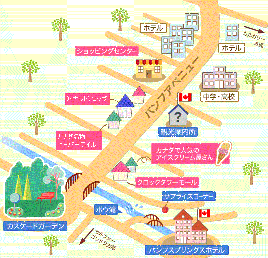 バンフ通りは土産店やレストランが集中しているバンフのメインストリートです。レストランやお土産店が多数立ち並んでおりショッピングや街並み散策を楽しんで頂けます。また、ホテル街から待ちの中心街までは徒歩10~20分程の距離にあり自由散策にも適した街です。