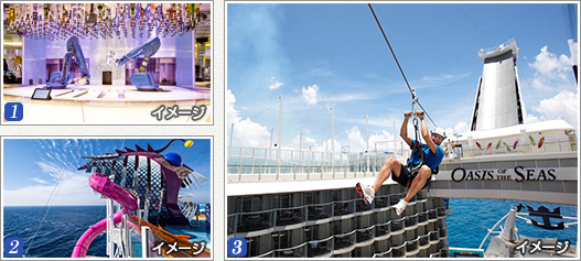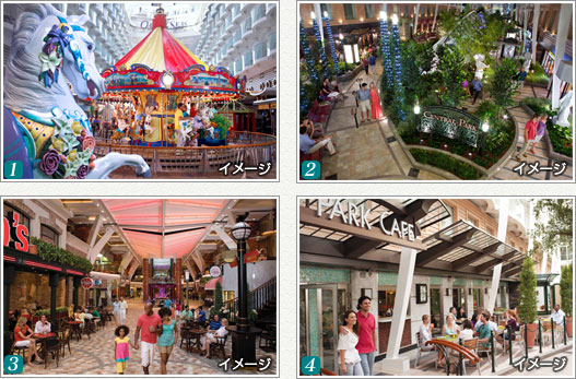 さまざまなレストランやカフェ、ショップが並ぶロイヤル・プロムナードを始め、洋上初の遊園地や公園などが備えられ、雰囲気は「船内」というよりも、まるでどこかの街中にいるかのようです。まさに洋上に誕生した“動く街”です!