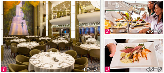 船内にはメインダイニングをはじめ、16ヵ所のレストランやカフェがあり、ビュッフェやイタリアン、ステーキなど種類も豊富。