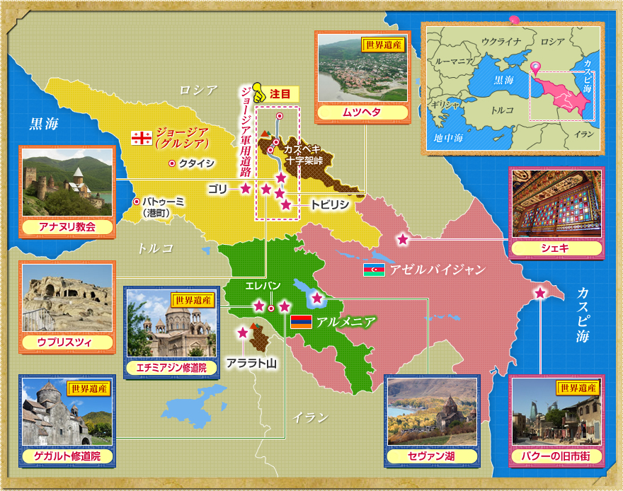 コーカサス3国旅行・ツアー・観光なら、クラブツーリズムにおまかせ!添乗員付きのツアーだから安心で快適です。アゼルバイジャン・ジョージア(グルジア)・アルメニアの観光地情報、おすすめのツアーをご紹介。ツアーの検索・ご予約も簡単。