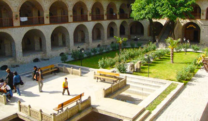 中国との間を行き来する隊商のためにシェキハーンが建てたキャラバンサライ(隊商宿)があり、18~19世紀にかけて利用されました。5つある隊商宿のうち、一番大きく、現在ではホテルとしても利用されています。また、キャラバンサライに並び、シェキハーンの夏の離宮として建てられたシェキハーン宮殿は、ステンドグラスなどの美しい内装が魅力的です。