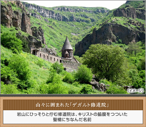 13世紀に標高1,700メートルの高地に建造された、アルメニアが誇る貴重な建造物です。「ゲガルト」とは、アルメニア語で「槍」の意味で、キリストが処刑された時に使用された「聖槍」がこの地で発見されたことにちなんでいます。