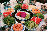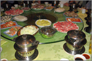 薄切りの羊肉をさっとゆでて、胡麻等のタレにつけていただきます。