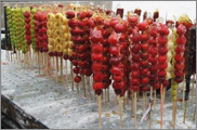 北地方の冬の風物詩。中国の伝統的飴菓子で、現在でも庶民に大人気です。串刺しにしたサンザシに、砂糖をからめて固めます。中身は、昔の定番はサンザシですが、最近はイチゴ、ミカン、バナナ等の新しい種類も登場しました。