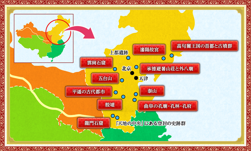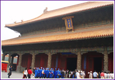 曲阜は儒教の創始者孔子の故郷で、孔子ゆかりの遺跡が保存されています。孔廟は孔子を祀っている霊廟で、南北1キロ、総面積2万平方メートル、部屋数466、門坊53基。中国最大の孔子廟、北京の紫禁城、泰山の岱廟とともに中国三大宮殿建築の一つとして知られています。孔林は孔子と一族の墓地で、世界で最も長く続いている一族墓地です。漢代には6.7アールの小さな墓でしたが、その後13回も修理拡張され、現在は総面積約2万平方メートル。十万を超える孔子の子孫達の墓碑が散在し、面積も世界最大の氏族墓地です。孔府は孔子の子孫が代々暮していた邸宅で、現在総面積は約1.2万平方メートル、480の部屋のある152の建物となっています。中国有数の規模を誇る邸宅でしたが、中華人民共和国建国後、孔家は台湾に移住しため、現在は観光地として一般公開されています。