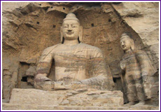 大同市の西16キロ、武周山南麓に、東西1キロに渡って彫られた雄大な石窟群です。仏像は高さ17メートルのものから数センチのものまで、5万体を越えます。敦煌の莫高窟、洛陽の龍門石窟と並ぶ中国三大石窟の一つです。北魏の文成帝の時に高僧曇曜の指導の下で460年に開削され、494年洛陽遷都前に大部分が完成しました。その後も造営が続けられ、隋・唐時代や遼・金時代の仏像も見ることができます。現存する代表的な石窟は53窟、中でも第5窟の雲崗一の高さ17メートルを誇る仏像が穏やかな表情で鎮座しています。最も早く彫り始められたのが第16~20窟で、「曇曜五窟」と呼ばれ、曇曜が文成帝を説き伏せ全身全霊を使って築きあげました。第20窟の露天大仏の釈迦牟尼座像は雲崗石窟の中の代表的作品で、雲崗石窟のシンボルになっています。