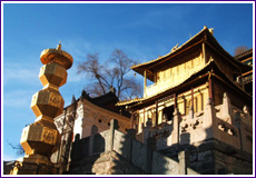 五台県にある文殊菩薩の聖山として、観音菩薩の霊場である普陀山と、普賢菩薩の霊場である峨眉山、地蔵菩薩の霊場である九華山と並び、中国四大仏教名山の一つです。チベット仏教の教徒からも尊崇を集めており、中国で唯一、仏教とチベット仏教の二つの宗教共通の聖地です。5つの峰が平坦で広い所から五台と呼ばれ、外側は台外、内側は台内と呼ばれます。台内の台懐鎮が五台山の中心地で、周りは東台の望海峰・西台の挂月峰・南台の錦綉峰・北台の葉頭峰(最高峰海抜3,058メートル)・中台の翠岩峰が聳えます。五台山は1世紀中頃から寺院の建立が始まり、5世紀の最盛期には300ヶ所以上のお寺がありました。うち47の寺院が現存し、最大の伽藍と最古の歴史を持つ顕通寺、高さ75.3メートルの大白塔が有する塔院寺、清の康熙・乾隆両帝も訪れた菩薩頂等があります。