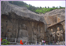 洛陽市の南13キロ、伊河畔に建てられ、敦煌の莫高窟、大同の雲崗石窟と並ぶ中国三大石窟の一つです。北魏の皇帝孝文帝が山西省の大同から洛陽に遷都した494年頃より開削が始まり、宋代まで約400年に渡って10万体の仏像が刻み込まれました。代表的な石窟は、北魏の宮廷生活を描かれている「賓陽三洞」、数センチの小仏が15,000体も彫られている「万仏洞」等があります。唐代に龍門石窟は最盛期を迎え、その絶頂期の石窟が、675年に完成した「奉先寺洞」です。龍門最大の石窟で、その本尊高さ17メートルの廬舎那仏は則天武后をモデルにしたと言われています。北魏時期に作られた他の仏像に見られる西方のヘレニズムの影響を感じさせない、中国的造形美の代表です。