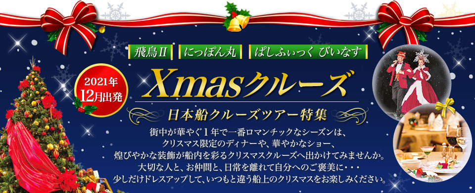 クラブツーリズムのクリスマスクルーズ旅行・ツアーをご紹介。飛鳥II、にっぽん丸、ぱしふぃっく びいなすなどの豪華客船でクリスマスクルーズをお楽しみください。各地から出航するクルーズやゲストエンターテイナーが彩るクルーズなど多彩なコースをご用意しております。