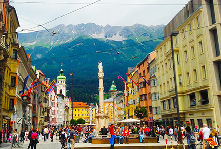 チロルの州都。ドイツ・イタリア間の貿易都市として栄えました。間近にアルプスに囲まれており、夏はハイキングの拠点として理想的な街です。「黄金の屋根」などハプスブルク家の歴史も残っております。