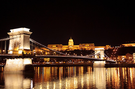 ドナウ川には次々と異なる構造形式の橋が架けられていますが、中でもくさり橋(正式にはセーチェニー橋)は、全長375m、幅員16mで、両岸には一対の石造の塔門が配されております。 夜のドナウ川クルーズでは、オレンジのライトでライトアップされ、この世のものとは思えないほど大変美しく、昼の顔とはひと味違った、ロマンチックなブダペストの街をご覧いただけます。 ハンガリーの首都ブダペスト。街のほぼ中央にドナウ川が南北に走り、西側のブダ地区、東側のペスト地区に分かれているブダペストは、「ドナウ川の真珠」と呼ばれ、多くの人を魅了し続けています。特に王宮・くさり橋・国会議事堂のライトアップとドナウ川が織り成す夜景は必見です!