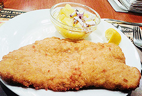 仔牛のもも肉を使ったウィーン風のカツレツ。出てくるとまずサイズに驚く方が多数。レモン汁を絞って食べるのがオススメ。