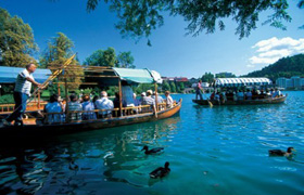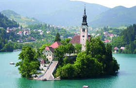 絵のように美しい「ユリアンアルプスの瞳」と称されるブレッド湖。湖に浮かぶブレッド島が印象的で、天気が良い日にはスロベニアのシンボルのユリアンアルプス最高峰・トリグラフ山も望めます。聖マリア教会はブレッド島にあり、手漕ぎボートに乗って渡ります。教会の鐘楼の鐘は7回鳴らすと幸運が訪れると伝えられいます。また、岸辺から教会までは99段の階段がありますが、この教会で結婚式を挙げる新郎は、新婦を抱きかかえて階段を上るのが習わしになっています。