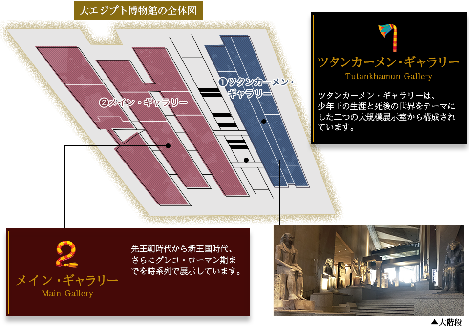 大エジプト博物館は、すでにソフトオープンしていた12室に及ぶメインギャラリー、そして、この度オープンしたツタンカーメン王の至宝が展示されているツタンカーメン・ギャラリーを擁し、敷地面積は約49万㎡(東京ドーム約10個分)に相当する広大な敷地を誇り、収蔵品は10万点以上。古代エジプトの約5,000年にわたる歴史を体感できる空間です。