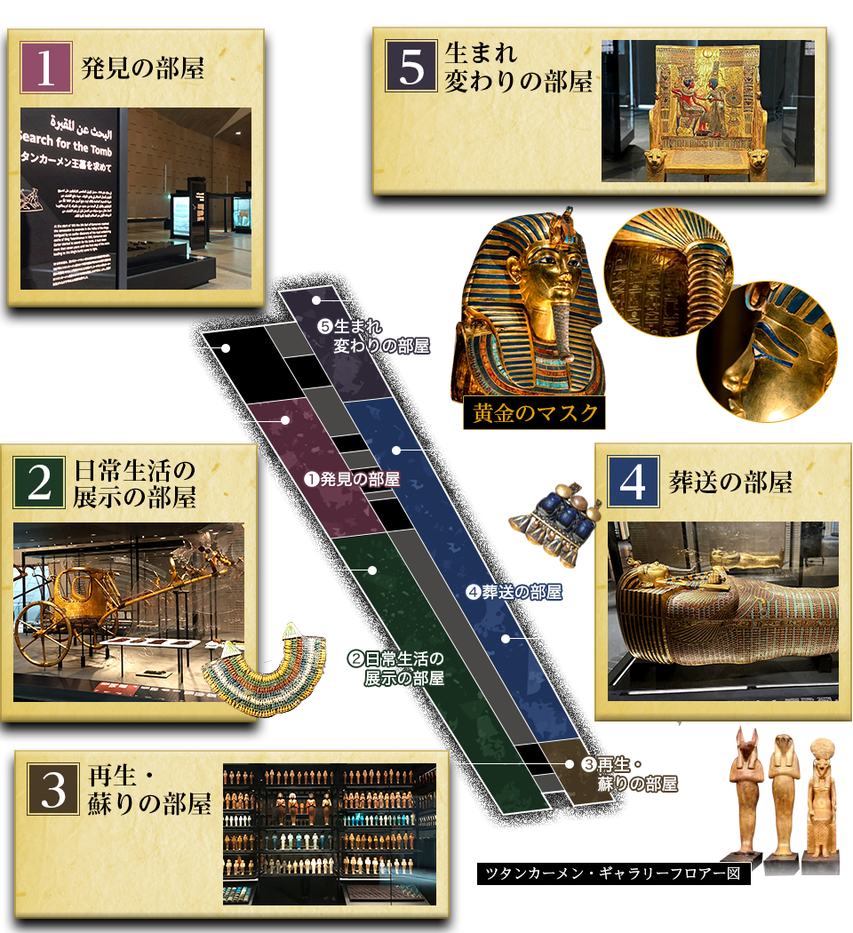 ツタンカーメンの生涯・宮廷生活・宗教儀礼・葬送儀式をテーマ別に分けて展示する構成となっており、展示品には、日本語のキャプションが付けられています。