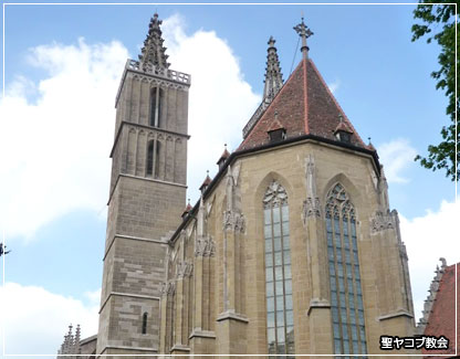 14世紀から15世紀にかけて、建てられたゴシック様式の聖ヤコブ教会は、マルクト広場の近くに建っています。ローテンブルクの中央教会とされ、十字軍が聖地エルサレムから持ち帰ったとされるキリストの聖血が祀られており、教会内には有名なドイツの彫刻家リーメンシュナイダーの「聖血の祭壇」が展示されています。