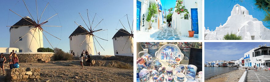 「エーゲ海の白い宝石」と呼ばれる島。白い迷路のようなミコノスタウンにはアートショップ、タベルナ(ギリシャ風食堂)などが立ち並びます。ベネチアンポートを臨むカト・ミリの風車から見る夕日は絶景です!