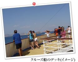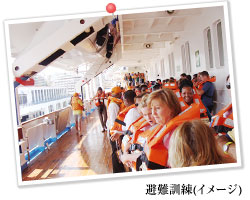 出港。避難訓練、船内説明、各種お手続き(クレジットカード登録など)をしましょう。乗船中は毎日日本語プログラムも配布されます。