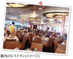 船内レストランにてビュッフェのランチです。食後は船内でリラックス、屋上デッキで日光浴がおすすめです。